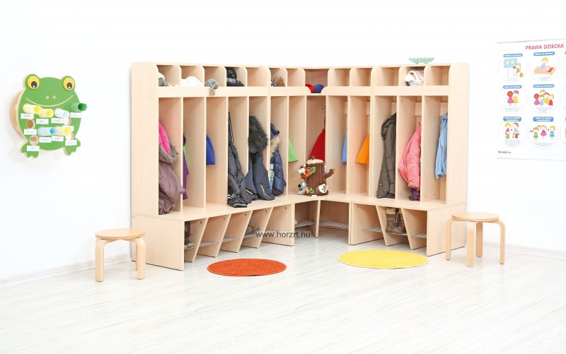 A szivárvány öltözőszekrény termékcsaládhoz tartozó sarokelem alacsony, 4 rekeszes verziója kimondottan intézmények számára, a legkisebb korosztály életkori sajátosságait figyelembe véve lett megtervezve.