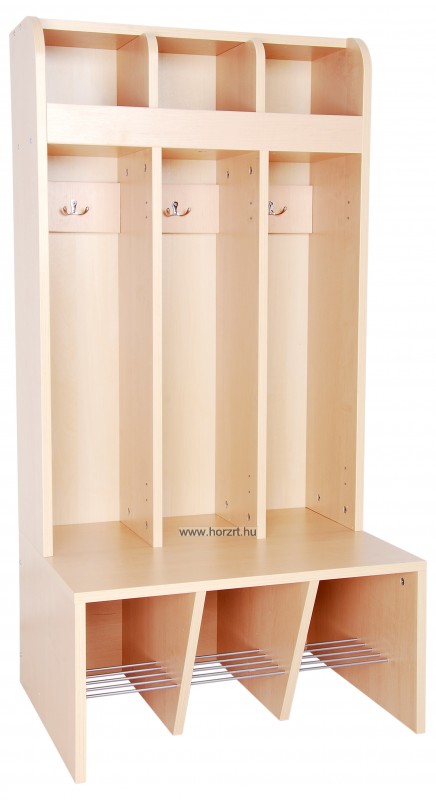 Az ülőfelület alatt rekeszenként külön-külön cipőtároló rácsos polc található. A rekeszeken belül 1-1 fém akasztó kapott helyet, a szekrény felső részén pedig kis polcok. A polcok szélei magasítottak, így biztonságosan tárolható rajtuk bármilyen kisebb tárgy. Az öltözőszekrény juhar színű laminált bútorlapból készült, melynek köszönhetően tartóssá és könnyen tisztíthatóvá válik. Rekeszek mélysége: 25 cm. A termék mérete: 66x50x124,5 cm. Az öltözőhöz külön vásárolhatóak színes ajtók többféle színvariációban.