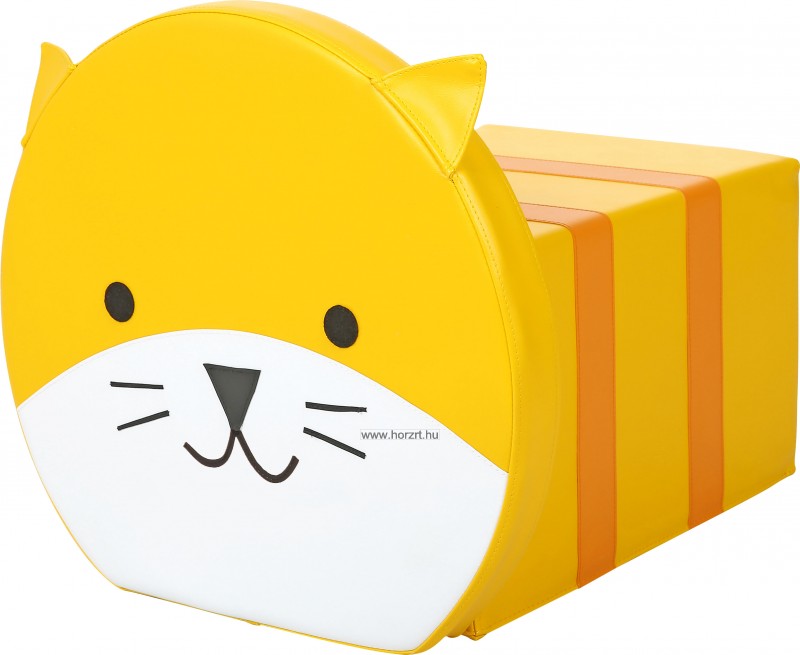 Cica ülőpárna és puff gyerekek számára. A műbőrrel bevont párna és puff citromsárga alapon naranccsárga csíkos. Az állatforma leválasztható a puff oldaláról és ülőpárnaként is használható. A párna kör alakú, a puff pedig négyszögletes, téglatest. Az ülőpárna egyben a cica feje is, így ezen látható az arc is. Pici fekete szemei és vékony mosolyra húzott szája van. Az arc egy része fehér, ez szimbolizálja a cica orrát, amit a rajta található fekete háromszög alakú orr és bajusz még jobban erősít. A fej tetején két citromsárga fülecske. A párna és a puff töltete is habszivacs. Teljes méret: 46x54x43 cm Ülőpárna mérete: 30x50x26 cm. A termék könnyen tisztítható.