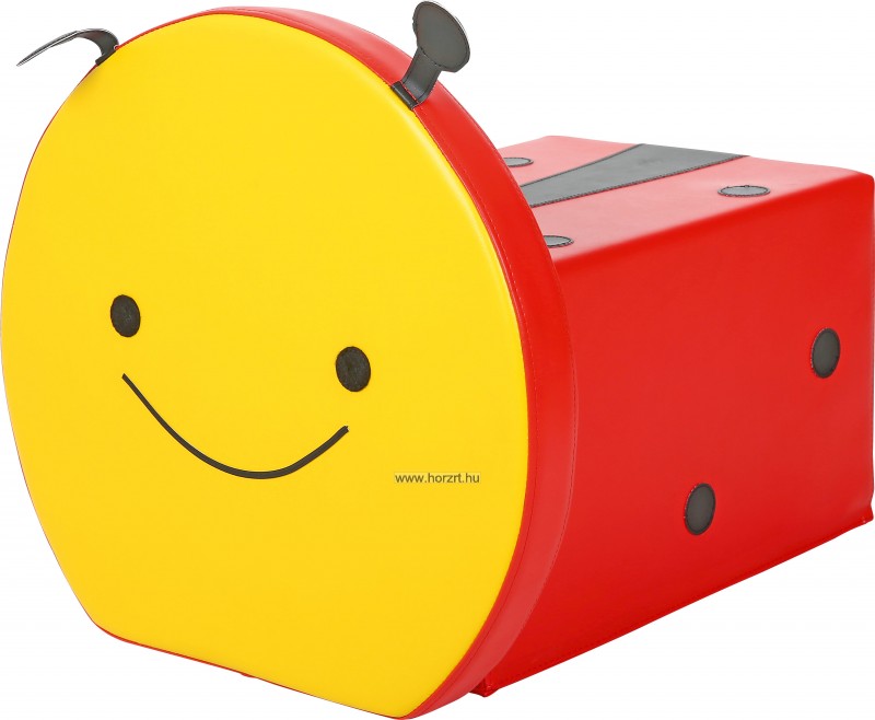 Katica ülőpárna és puff gyerekek számára. A műbőrrel bevont párna és puff piros alapon fekete pöttyös. A párna rész citromsárga, piros kerettel. Az állatforma leválasztható a puff oldaláról és ülőpárnaként is használható. A párna kör alakú, a puff pedig négyszögletes, téglatest. Az ülőpárna egyben a katica feje is, így ezen látható az arc is. Pici fekete szemei és vékony mosolyra húzott szája van. A fej tetején két fekete csápocska is megtalálható. A párna és a puff töltete is habszivacs. Teljes méret: 46x54x43 cm. Ülőpárna mérete: 30x50x26 cm. A termék könnyen tisztítható.