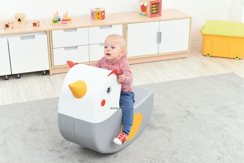 A ringató csibe egy puha műbőrrel bevont, habszivacsból készült billegő puff. Ívelt alsó része adja a játék billegő mozgását. A csibe teste világosszürke, feje fehér, kis szárnya citromsárga, az oldalán nem emelkedik ki a síkból. A csibe arca játékos, nagy szemei és citromsárga kiálló csőre van, piros kis arcpírral. A kiálló piros taraja akár kapaszkodóként is használhatóak. Széles ülőfelülete és magas megtámasztása van elől, így magas biztonsárérzetet nyújt a kicsiknek. Műbőr bevonata könnyen tisztítható. Mérete: 77x30x54 cm.