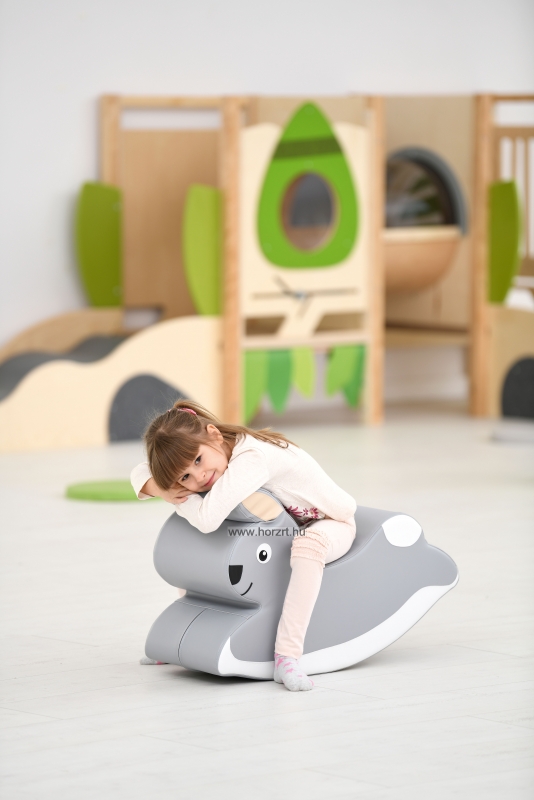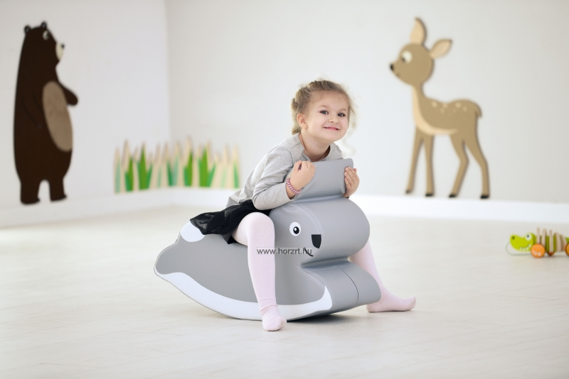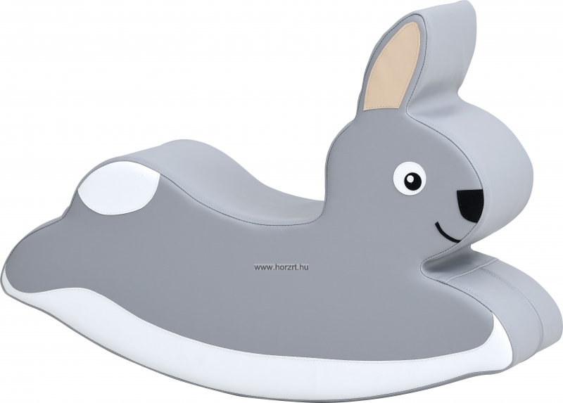 A ringató nyuszi egy puha műbőrrel bevont, habszivacsból készült billegő puff. Ívelt alsó része adja a játék billegő mozgását. A nyuszi hasa fehér, teste és feje világosszürke, farkincárja fehér, nem emelkedik ki a síkból. A nyuszi arca játékos, nagy szemei és fekete orra és kis mosolyra húzott szája van. A kiálló fülei kapaszkodóként is használhatóak. Széles ülőfelülete és magas megtámasztása van elől, így megfelelő biztonsárérzetet nyújt a kicsiknek. Műbőr bevonata könnyen tisztítható. Mérete: 73x26x54 cm.