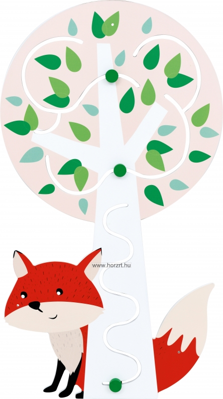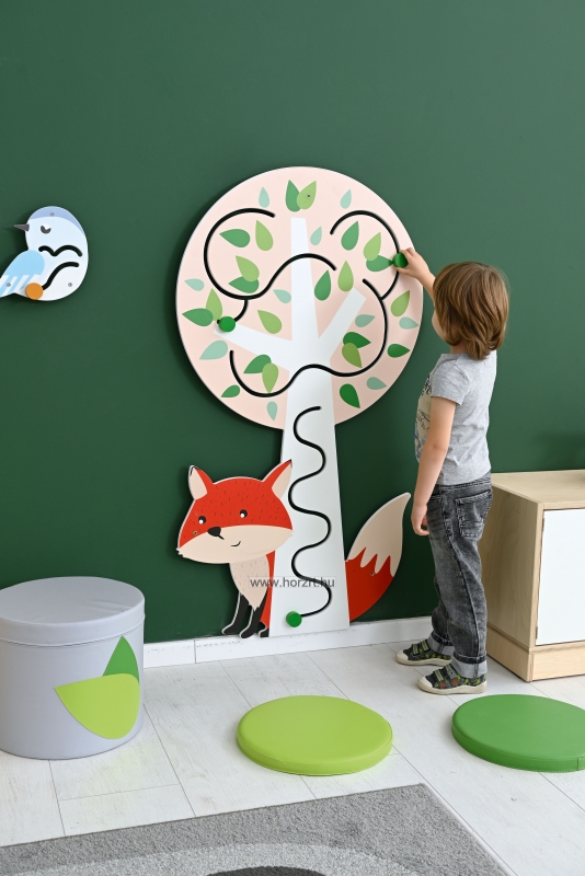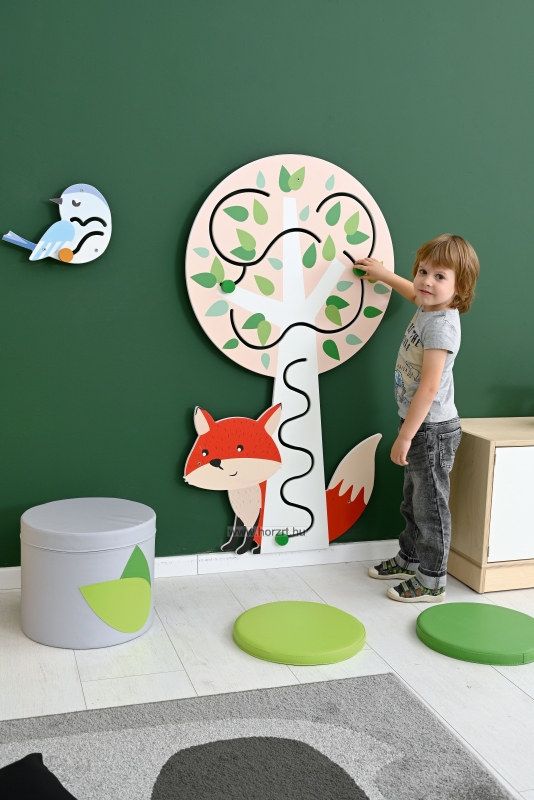 Feladat: Vezesd végig a zöld kis korongokat a fa törzsén és a lombkoronában is! A fa mögül kukucskáló kicsi róka kedvesen mosolyog és figyeli, hogy milyen ügyesen végzed a feladatot!