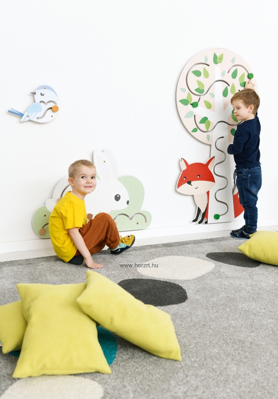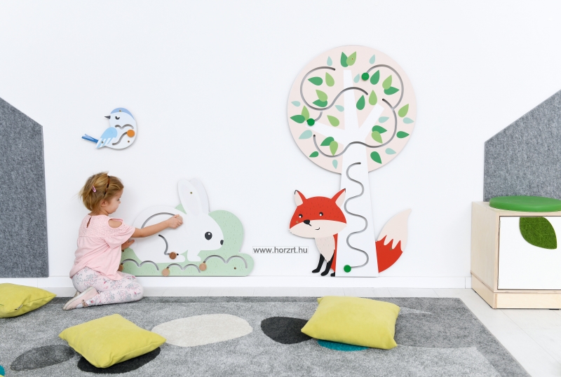 A falra szerelhető Kis Vukot ábrázoló vonalvezető vidám és színes megjelenésével nem csupán a dekorációért felel, hanem készségfejlesztő feladatokat is lehet vele végezni.
