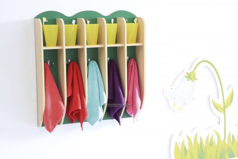 5 fakkos törölköző- és fogmosópohár tartó 5 különböző színben. Praktikus kiegészítő, 5 fogmosópohár tartóval, 10 akasztóval, ahova a törölközőket lehet felakasztani.