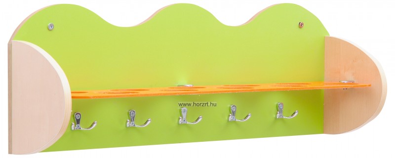 Felhőcske formájú fogmosópohár tároló polc és törölköző akasztó kimondottan gyerekek számára lett kialakítva. A polc hátlapja zöld színű, felső része hullámvonalban megvágott, Oldalai félkör alakú, natúr fa színű elemek, ehhez csatlakozik a narancssárga műanyag, pohártartó polc, melybe 10 pohár helyezhető. A műanyag polcon kör alakú lyukak vannak, ezekbe helyezhetőek a poharak. Kialakításának köszönhetően stabilan tartja a poharakat, így nem esnek le vagy nem lehet leverni őket. A polc alatt 5 db kétágú fogas található. A termék mérete: 67,5x18x25cm. A pohártartó átmérője: 7cm. Anyaga: MDF bútorlap és műanyag.