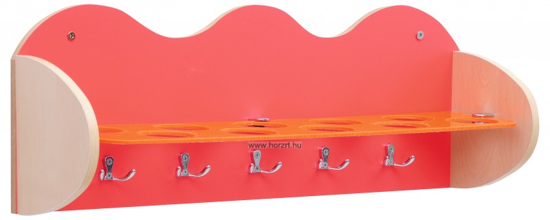 Felhőcske formájú fogmosópohár tároló polc és törölköző akasztó kimondottan gyerekek számára lett kialakítva. A polc hátlapja piros színű, felső része hullámvonalban megvágott, Oldalai félkör alakú, natúr fa színű elemek, ehhez csatlakozik a narancssárga műanyag, pohártartó polc, melybe 10 pohár helyezhető. A műanyag polcon kör alakú lyukak vannak, ezekbe helyezhetőek a poharak. Kialakításának köszönhetően stabilan tartja a poharakat, így nem esnek le vagy nem lehet leverni őket. A polc alatt 5 db kétágú fogas található. A termék mérete: 67,5x18x25cm. A pohártartó átmérője: 7cm. Anyaga: MDF bútorlap és műanyag.