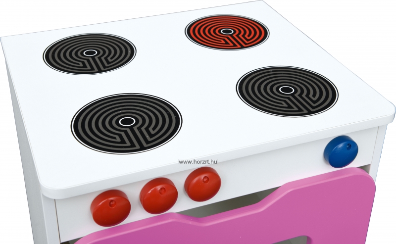 A tetején 4 főzőzóna található, az elején pedig 3 piros, és egy kék gomb. A sütőtér ajtaja kinyitható.