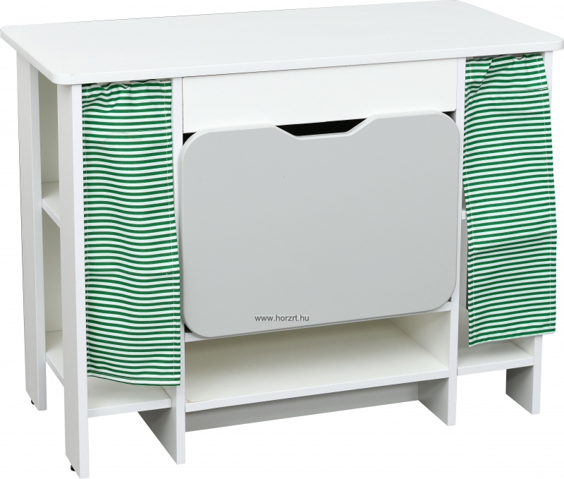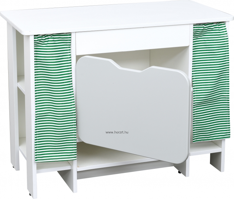 Ez a széles polcos kis szekrény kiválóan alkalmas végelemnek a színes konyhabútorhoz. Így a termék térbe állítva is jól mutat és sok gyermek tud egyszerre szerepjátékot játszani.