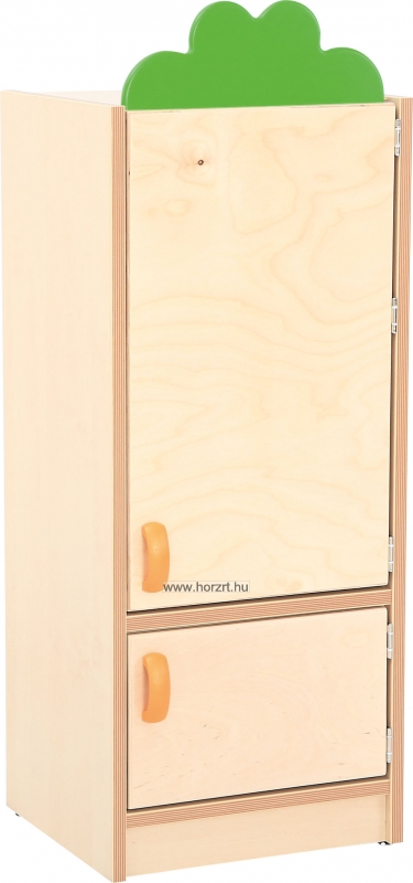 A kis hűtőgép juhar és zöld színű elemekből áll.