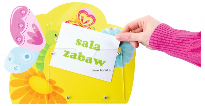 Színes tábla, aranyos és vicces alakzatban, amit a falra tudunk akasztani.A táblán van egy kis tartó amibe bármilyen szöveget beletudunk tenni, akár nevünket, vagy a csoport nevét. A plexi üveg mérete A6. Szuper kiegészítője a szobának.