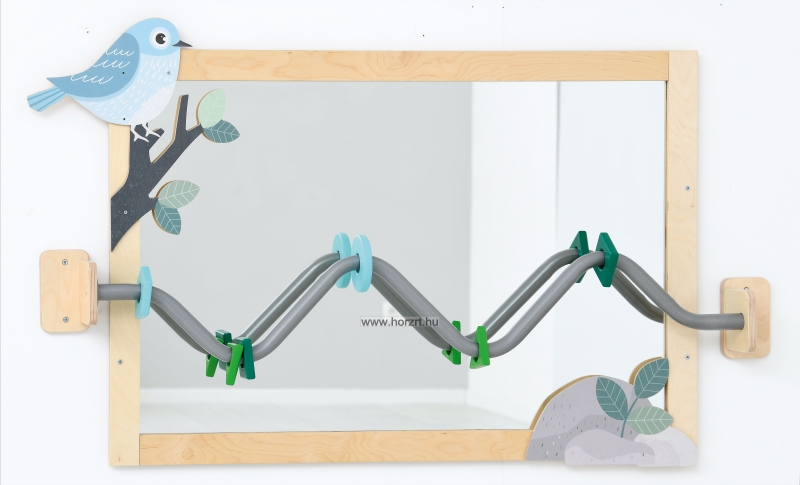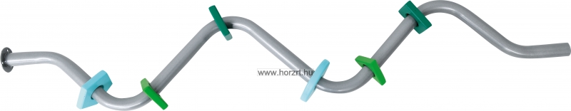 Falra szerelhető szem-kéz koordinációt fejlesztő ezüst színű, cikcakkos fémrúd, amelyen színes fa formák találhatók.