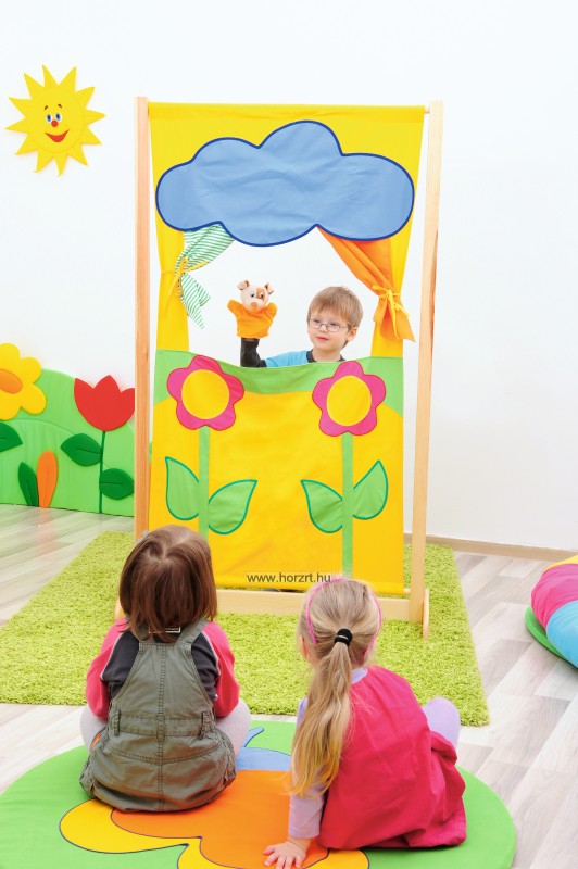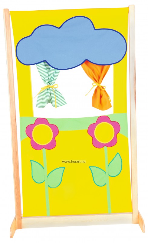Az időjárás tematikájú bábszínház ideális térelválasztónak is. A natúr fa keretre egy citromsárga színű textil színházat lehet kifeszíteni. A színházat az időjárás témája ihlette, citromsárga alapháttere előtt két rózsaszín szirmű, zöld, leveles szárú virág látható. Felső részén egy kék felhő van, melyből egy narancssárga és egy zöld-fehér csíkos függöny lóg le. A termék színei élénkek és figyelemfelkeltőek. A felhő alatti nyíláson keresztül elbábozható számos mese és történet. Mérete: 92x40x154 cm