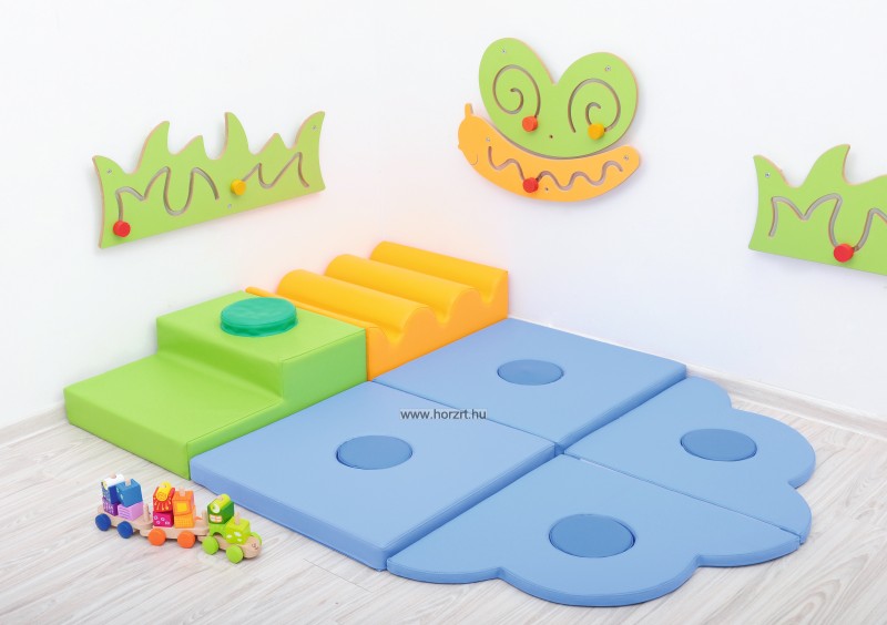 A szivacsmodul-négyzet oldalán tépőzár helyezkedik el, így több elem is biztonságosan összeilleszthető. A közepén kivehető körszivacs van. Motoros koordináció fejlesztésére szolgál.