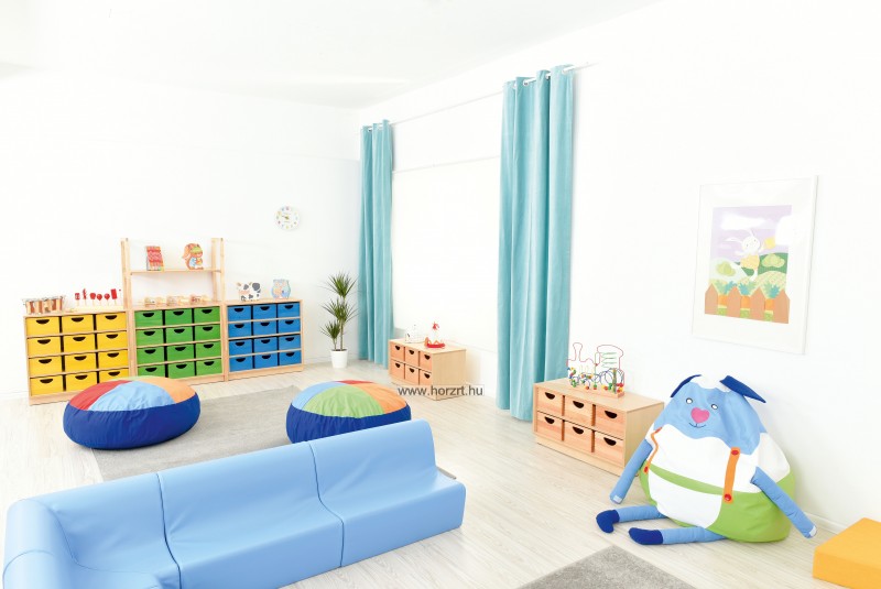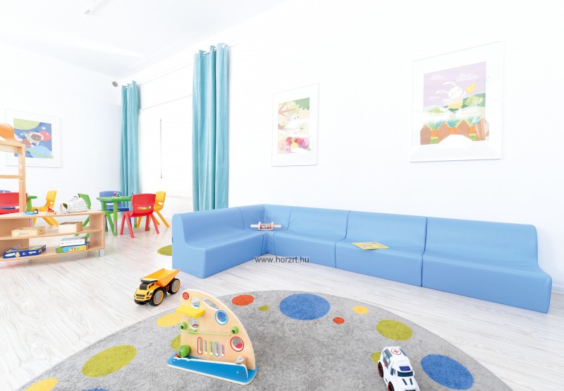 Szivacskanapé ftalátmentes műbőr borítással. A kényelmes habszivacs kanapé világoskék műbőrrel van bevonva, így a tisztítása egyszerű és gyors. A kanapé ülésmagassága 26 cm, kimondottan gyerekek számára lett kielakítva. Szélei lekerekítettek. Háttámlájának dőlésszöge megfelelő tartást nyújt a hátnak. A kanapé mérete 75x50x52 cm.