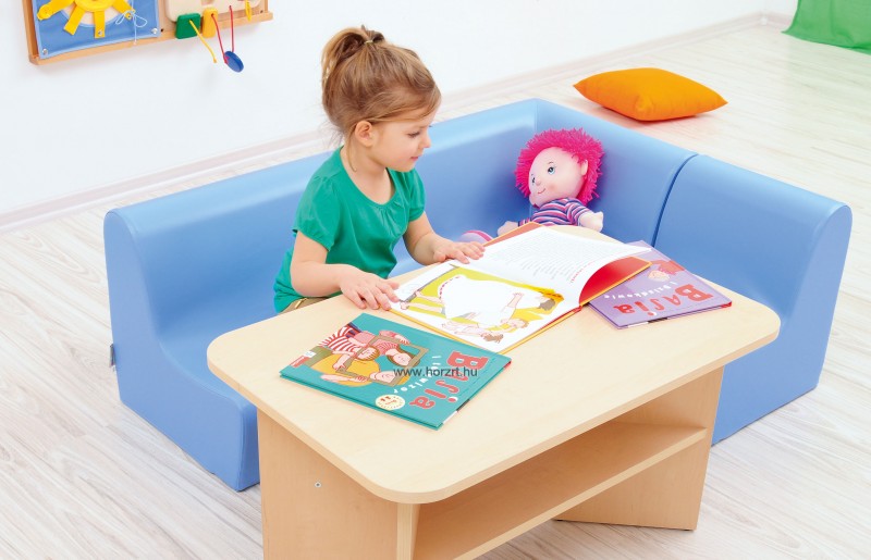 Szivacskanapé ftalátmentes műbőr borítással. A kényelmes habszivacs kanapé világoskék műbőrrel van bevonva, így a tisztítása egyszerű és gyors. A kanapé ülésmagassága 31 cm, kimondottan gyerekek számára lett kielakítva. Szélei lekerekítettek. Háttámlájának dőlésszöge megfelelő tartást nyújt a hátnak. A kanapé mérete 85x63x62 cm.