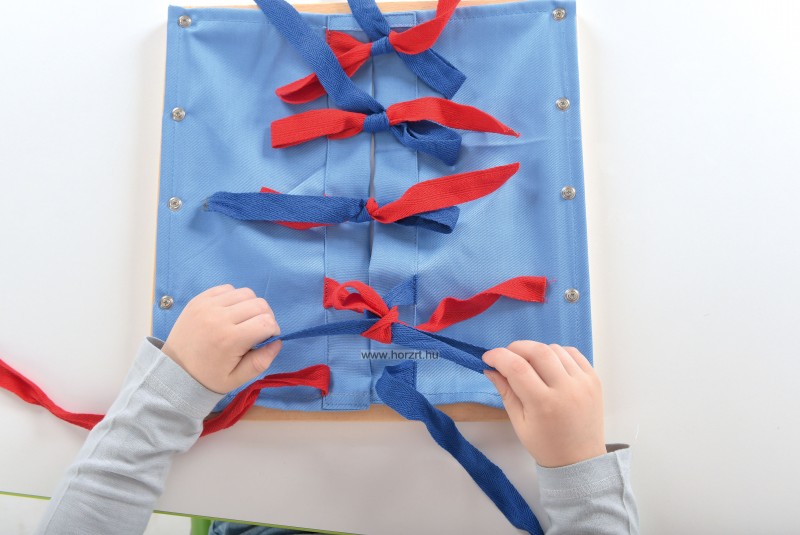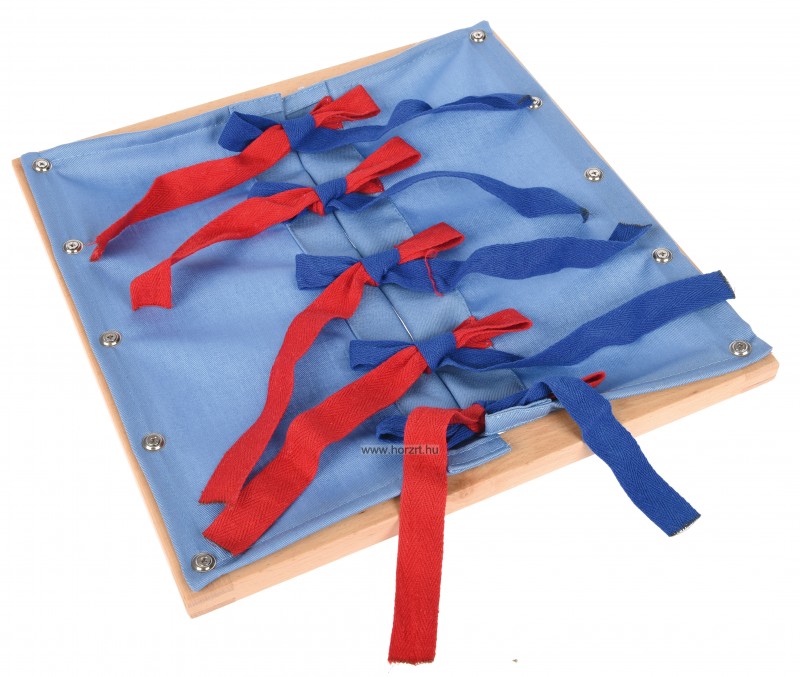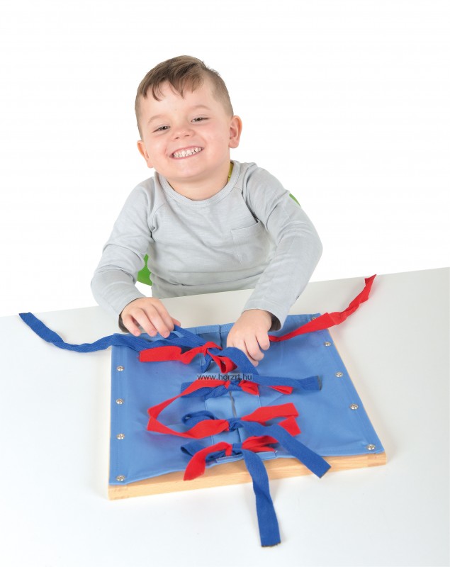 Játék kicsiknek, amellyel fejlődik a tapintásérzékük és egyben megmutatja azt is hogyan kell megkötni egy szalagot. A szövet egy fa kereten két oldalt található, és ezeket kell ügyesen összekötni.