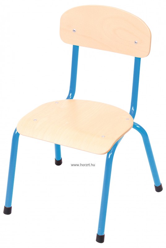 Csővázas gyerekszék kék színben. Az ülőfelület és a háttámla is bükk színű, lakkozott rétegelt lemezből készül. A szék váza fém, a lábak végére fekete színű lábvég dugó helyezhető, amit a csomag tartalmaz. A szék ülésmagassága 26 cm, egymásra rakásolható.