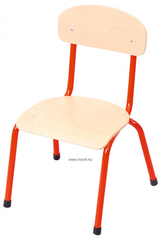Csővázas gyerekszék piros színben. Az ülőfelület és a háttámla is bükk színű, lakkozott rétegelt lemezből készül. A szék váza fém, a lábak végére fekete színű lábvég dugó helyezhető, amit a csomag tartalmaz. A szék ülésmagassága 26 cm, egymásra rakásolható.