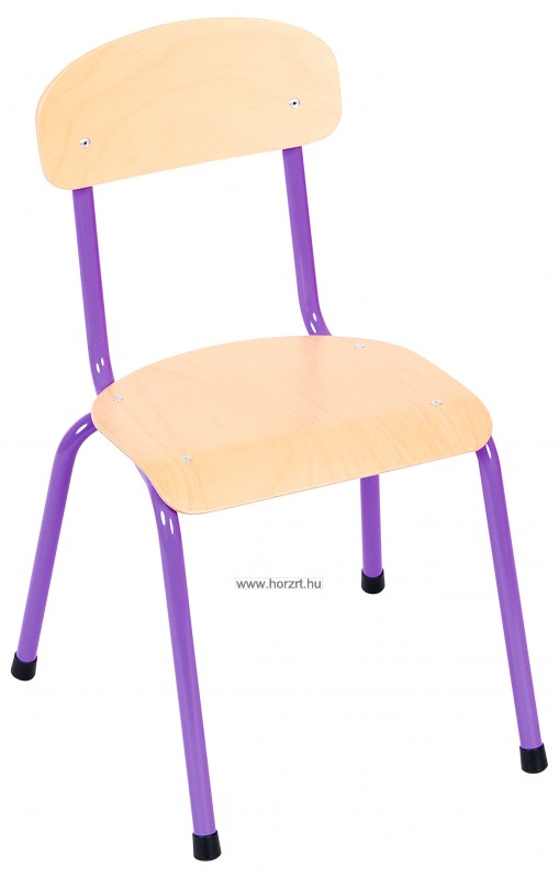 Csővázas gyerekszék lila színben. Az ülőfelület és a háttámla is bükk színű, lakkozott rétegelt lemezből készül. A szék váza fém, a lábak végére fekete színű lábvég dugó helyezhető, amit a csomag tartalmaz. A szék ülésmagassága 31 cm, egymásra rakásolható.