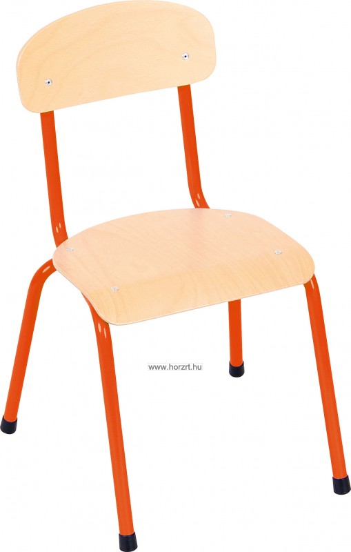 Csővázas gyerekszék narancssárga színben. Az ülőfelület és a háttámla is bükk színű, lakkozott rétegelt lemezből készül. A szék váza fém, a lábak végére fekete színű lábvég dugó helyezhető, amit a csomag tartalmaz. A szék ülésmagassága 31 cm, egymásra rakásolható.