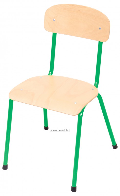 Csővázas gyerekszék zöld színben. Az ülőfelület és a háttámla is bükk színű, lakkozott rétegelt lemezből készül. A szék váza fém, a lábak végére fekete színű lábvég dugó helyezhető, amit a csomag tartalmaz. A szék ülésmagassága 35 cm, egymásra rakásolható.