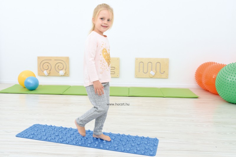Kék színű, masszírozó szőnyeg, kő formájú kiemelkedő betétekkel.