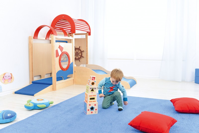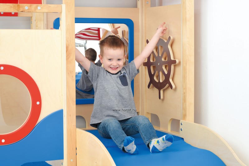 Játszócentrum kicsiknek hajóskapitány tematikával. A színes kiegészítők MDF bútorlapból készültek, az ablakok plexiüvegből. A padlófelület csúszásmentes szőnyeggel van lefedve és a csúszda műbőrrel bevont habszivacs.