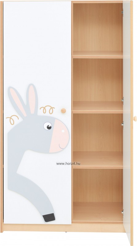 Csacsi díszítéssel ellátott kétajtós szekrény. A szekrény belsejében 3 polc található, középen válaszfallal. Ajtók szélessége: