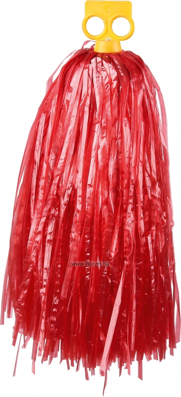 Piros színű, kicsi pompom gyerekeknek. A pompom szálait egy műanyag citromsárga elem fogja össze, ami egyben a fogó rész is. A két köralakú lyukba a gyerekek bedughatják ujjacskáikat, így kényelmesen játszhatnak vele. A szálak műanyagból készültek, a termék mérete: 28 cm.