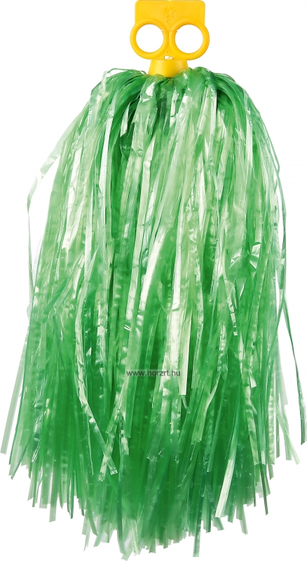Zöld színű, kicsi pompom gyerekeknek. A pompom szálait egy műanyag citromsárga elem fogja össze, ami egyben a fogó rész is. A két köralakú lyukba a gyerekek bedughatják ujjacskáikat, így kényelmesen játszhatnak vele. A szálak műanyagból készültek, a termék mérete: 28 cm.