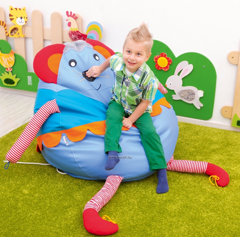Az óriás egér párna anyaga különböző textúrájú textilekből, műbőrből áll össze.