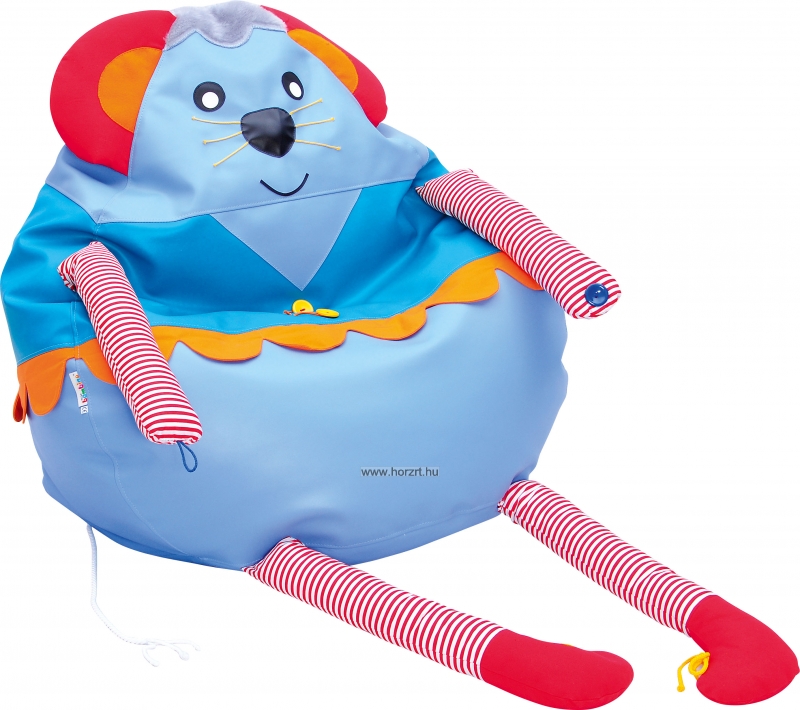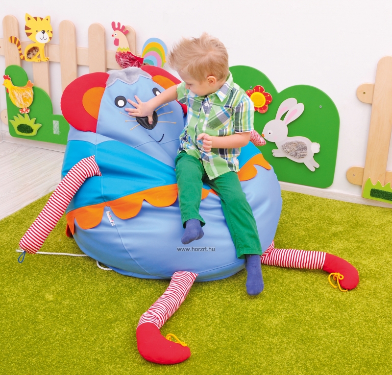 A finommotorika fejlesztése érdekében gombolós és megkötős részletek is helyet kaptak a párnán. Érzékszervi, szenzoros elemek: gombmancsok, műbőr orr, susogó fülek, szőrös pamacs a fejen, gombok a hason, hátsó lábakon fűző, granulátum töltelék. Töltetének köszönhetően felveszi a gyermek formáját.