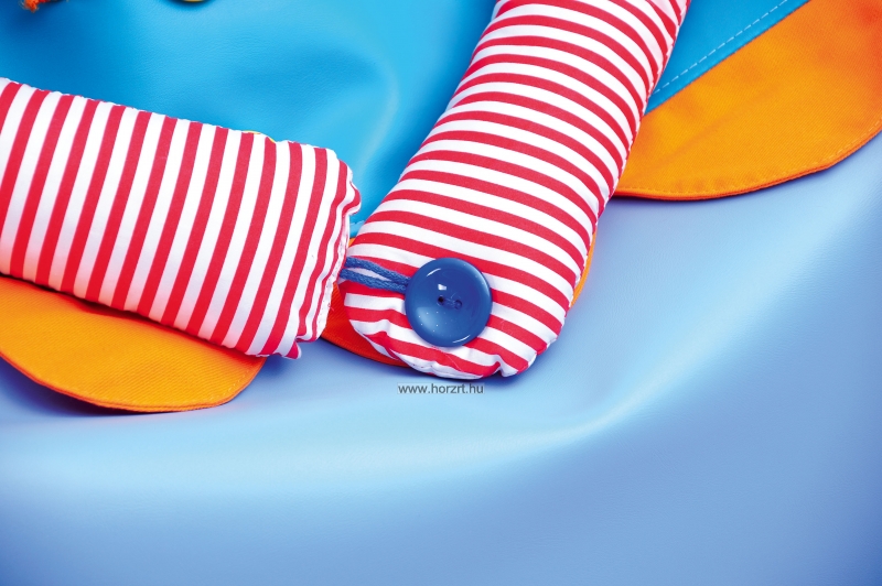 A párna színei élénkek és vidámak. Dominánsan a kék árnyalatai, a piros és a narancssárga figyelhető meg.