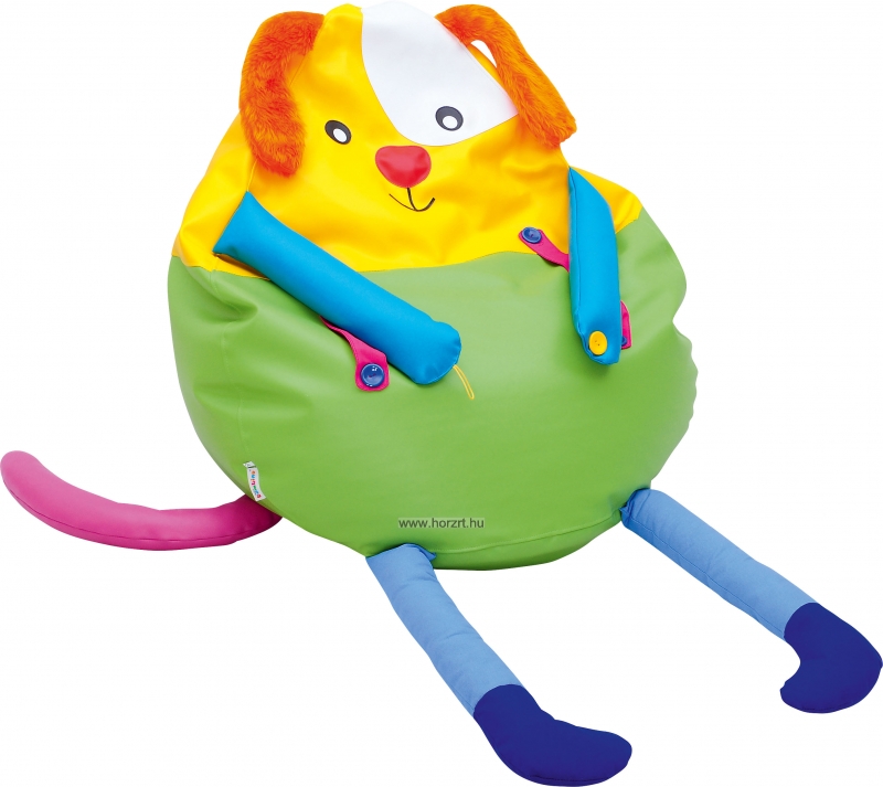Az óriás kutyus párna anyaga különböző textúrájú textilekből, műbőrből áll össze.