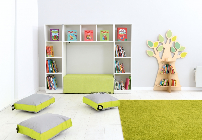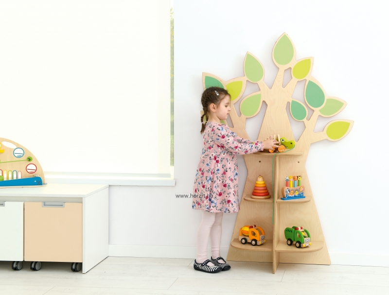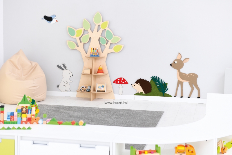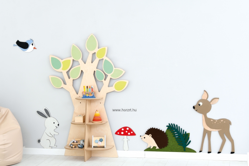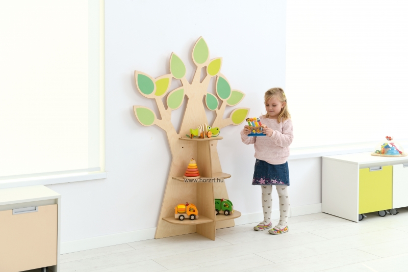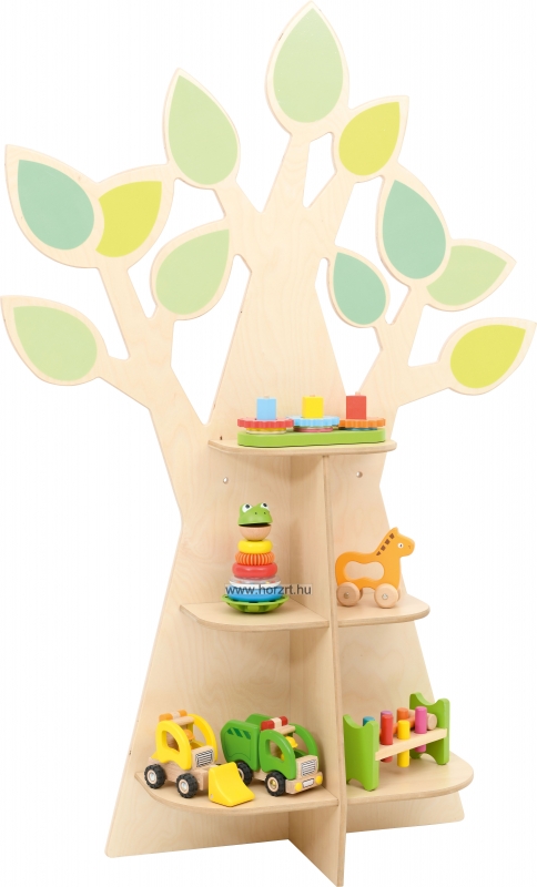 Fa alakú tárolópolc dekoratív levelekkel, rétegelt falemezből. 3 db 2-2 részre osztott polccal felszerelve könyvek, és játékok számára.