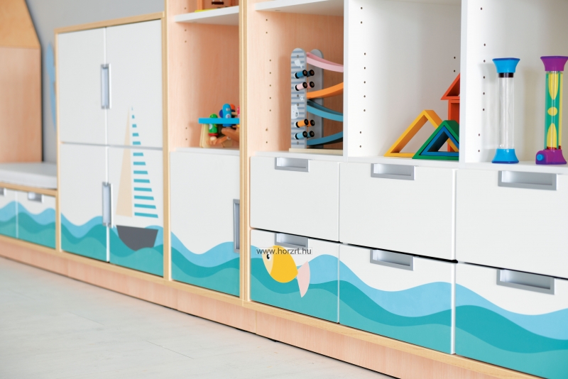 A színes, gyermekbarát motívumok inspiráló, de visszafogott környezetet teremtenek és játékra, tanulásra ösztönöznek. A szekrénysor csak egyben rendelhető!