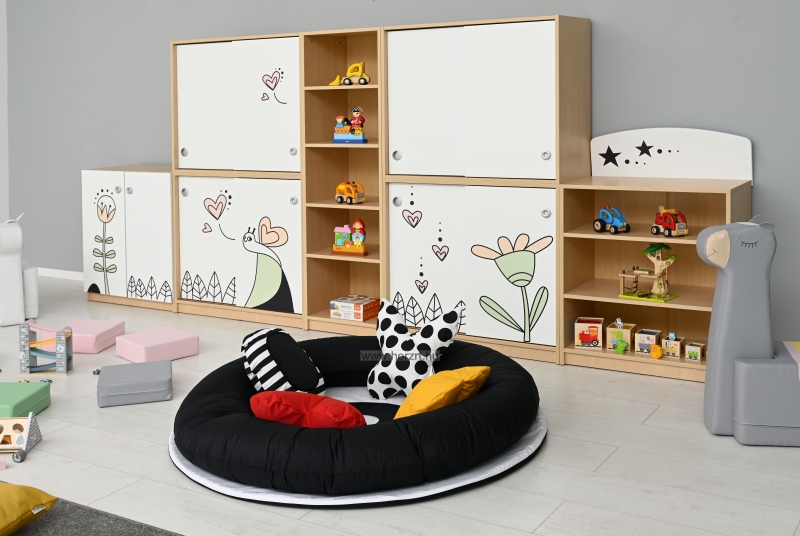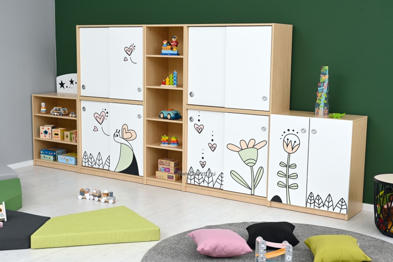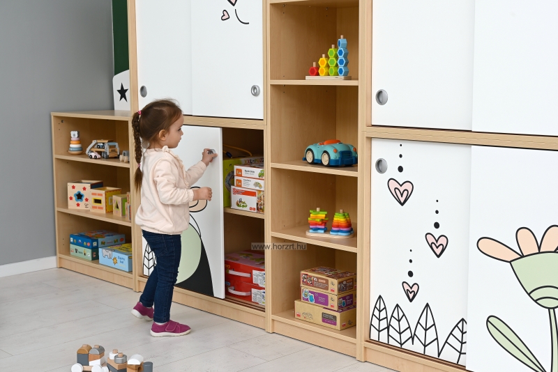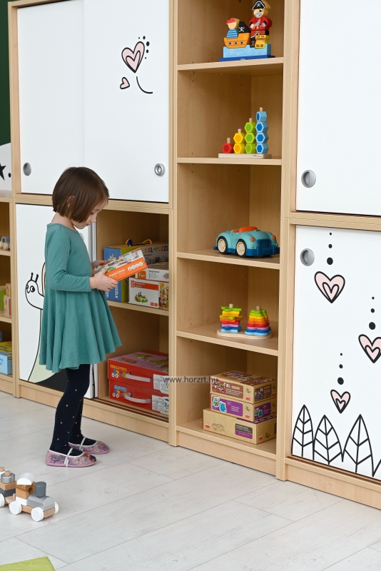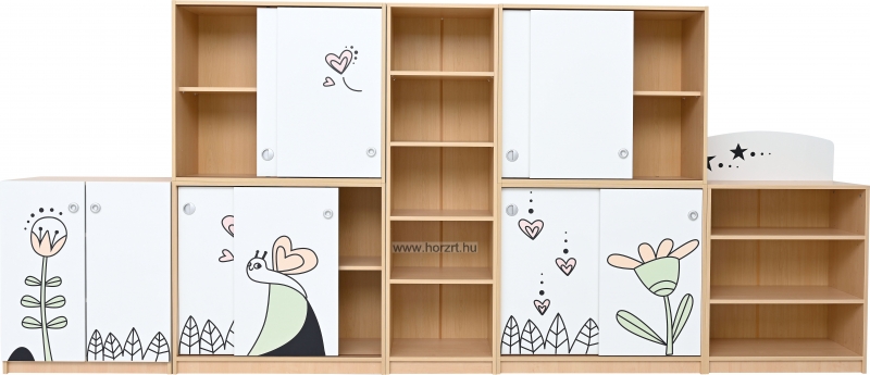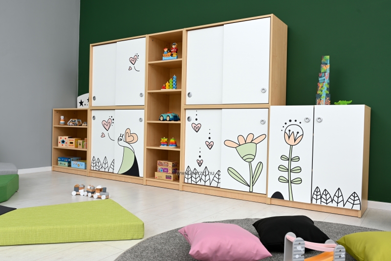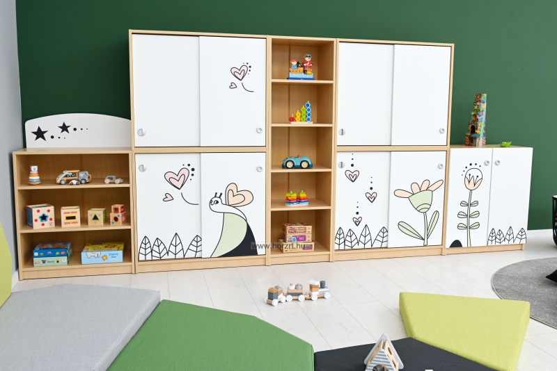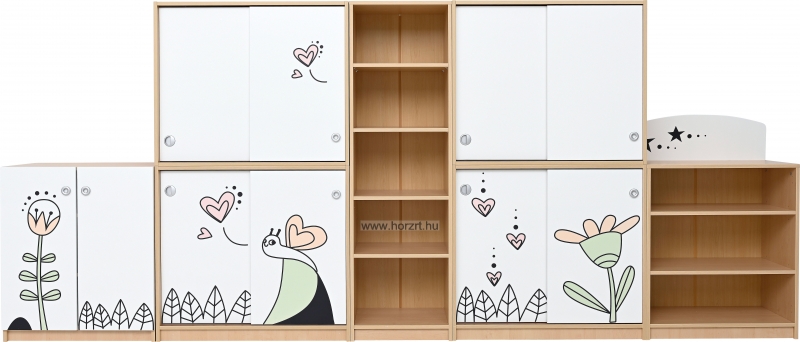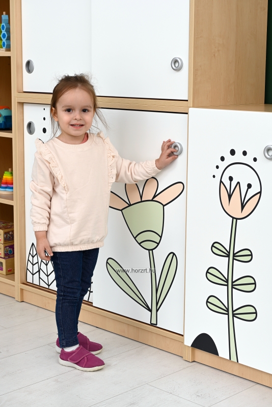 A szekrények 18 mm vastag nyírfa laminált lapból készültek, fehér alapon mintás MDF ajtókkal.