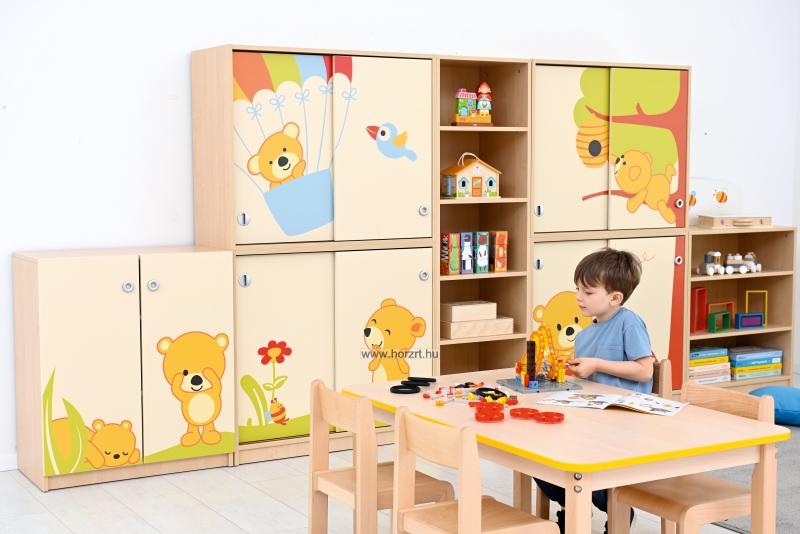 - Pántos ajtóval kialakított elem, alvó macis díszítéssel