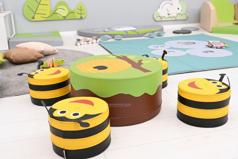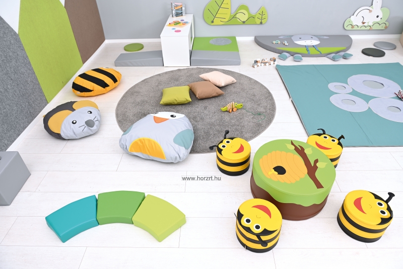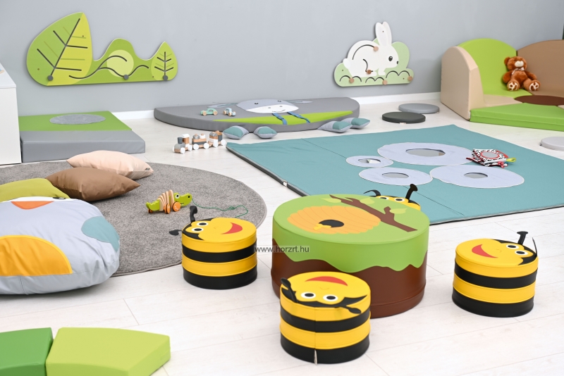 A kedves méhecskés játszósarok szett kiválóan alkalmas bölcsődei használatra, hiszen az elemek alacsony mérete lehetővé teszi a kényelmes és biztonságos használatot a legkisebbek számára is.