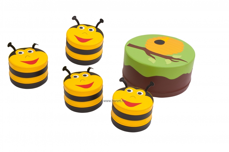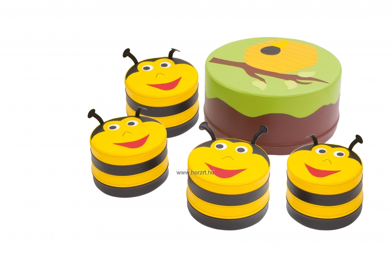 Csomag tartalma: 1 db kaptármintás asztalka, 4 db méhecskés puff