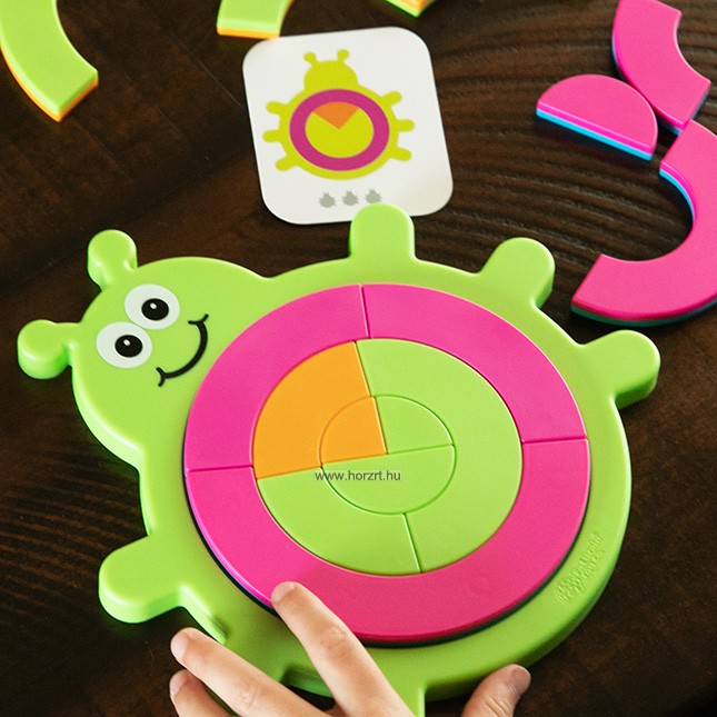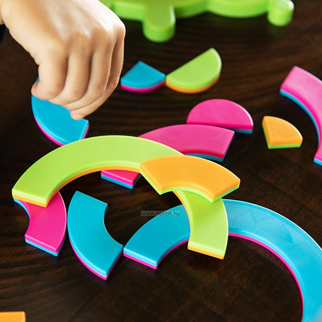 Válassz ki egyet a 40 feladatkártya közül, majd helyezd el a különböző formájú, színű és méretű puzzle darabokat a kör alakú tálcán.