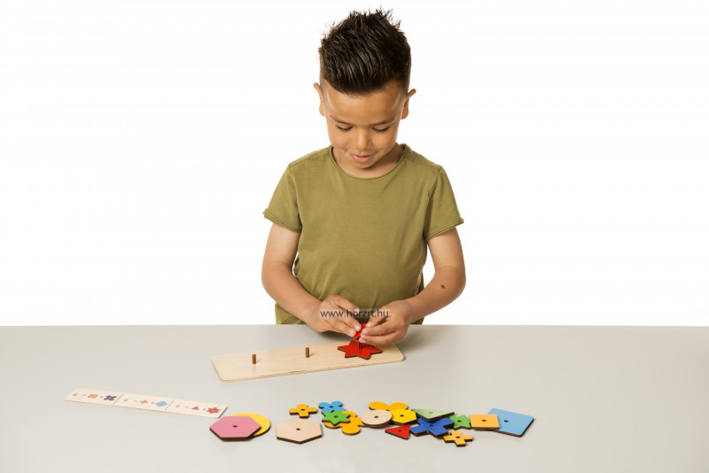 1.Válasszunk ki egy feladatkártyát, amelyen kérdőjelet látunk az összeadás eredményeként. Végezzük el az „összeadást”. Vagyis keressünk meg a megfelelő formákat és azokat tegyük egymásra. A feladatkártya másik oldalán ellenőrizhető, hogy jól dolgoztunk-e.