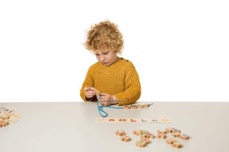 A fűzőcskézés közben nagyszerűen fejleszthető a szín- és formafelismerés, a válogatás, a vizuális diszkrimináció, a finommotorikus készség és a sorozatalkotó képesség.