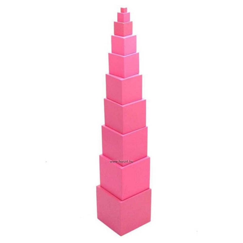 A Montessori Rózsaszín Torony 10 különböző méretű fa kockából áll, melyek oldalhossza 1 és 10 cm között változik, minden kocka éle pontosan 1 cm-rel nagyobb az előzőnél.