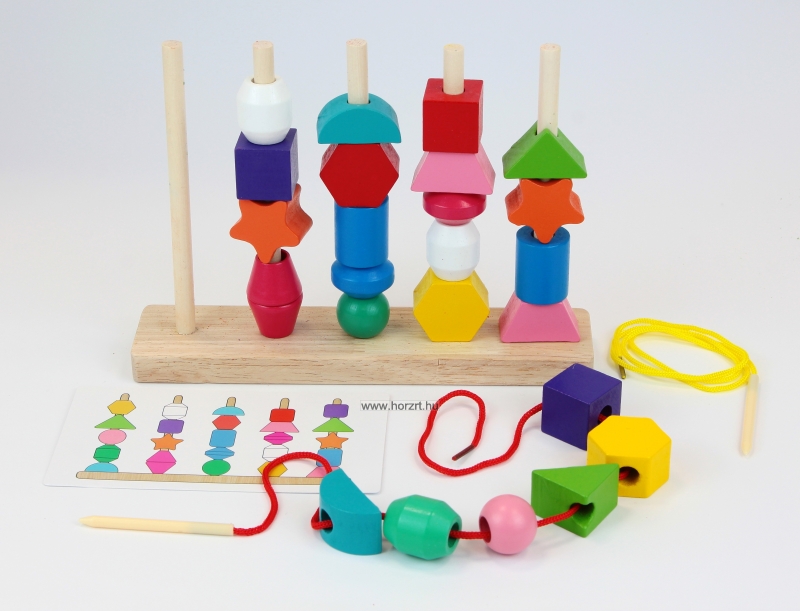 - Fűzős soralkotás: adjunk meg szabályt – pl. piros-kék-piros – a gyermek fűzze fel a megfelelő elemeket.