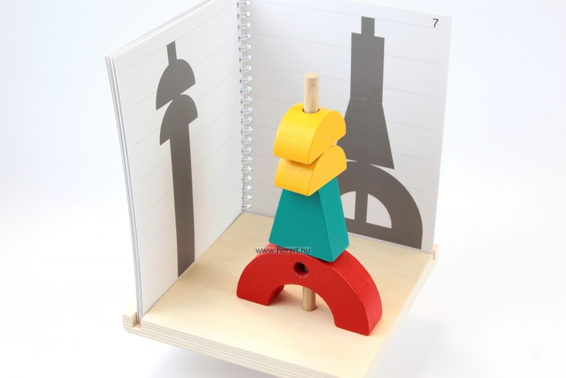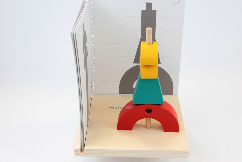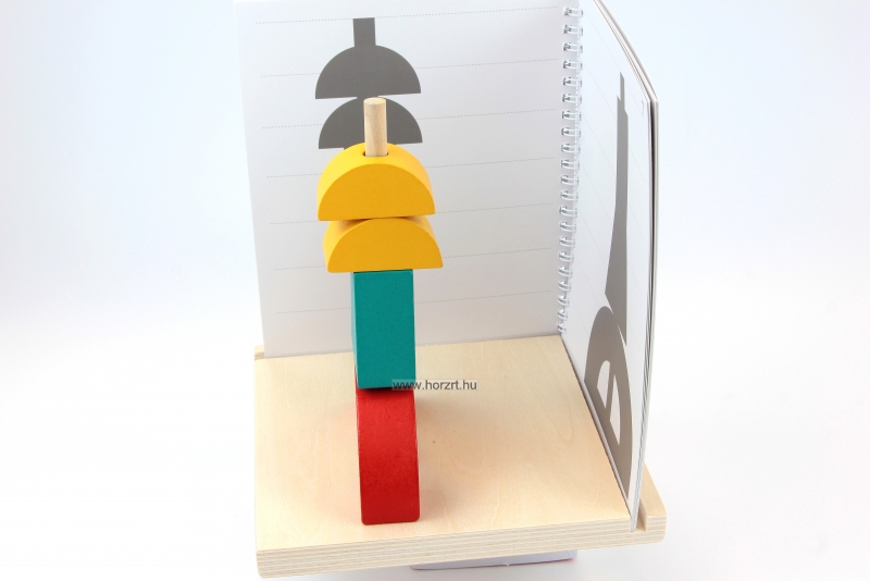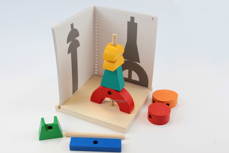 Építse meg a formát a színes elemek segítségével a függőleges rúdra fűzve vagy egymásra helyezve.