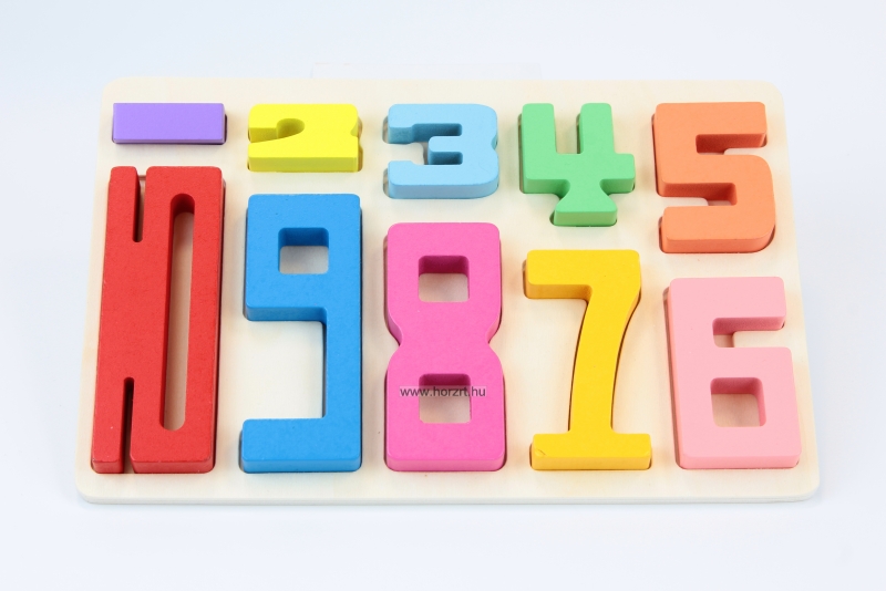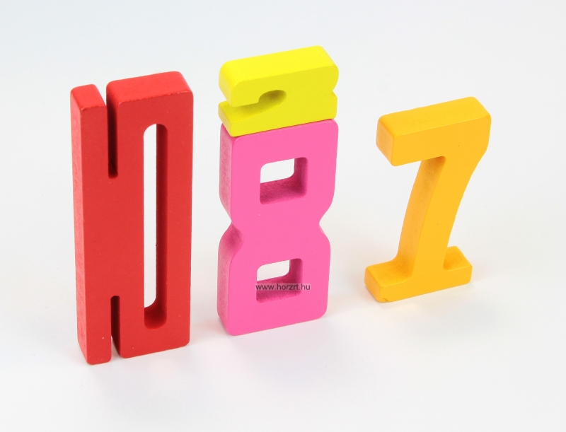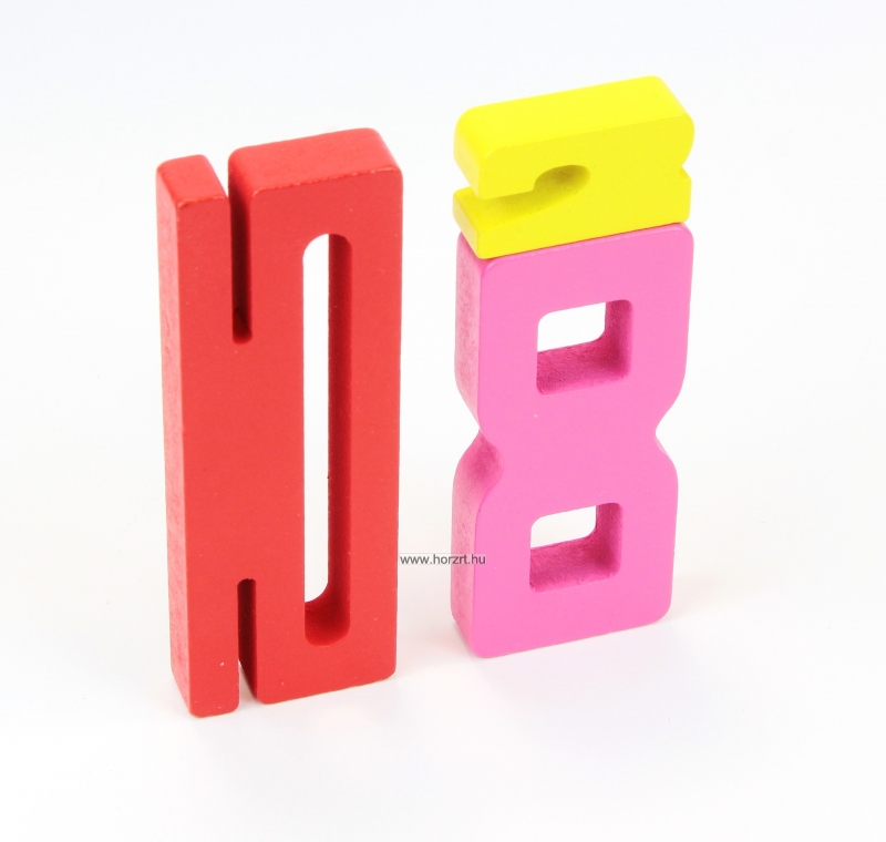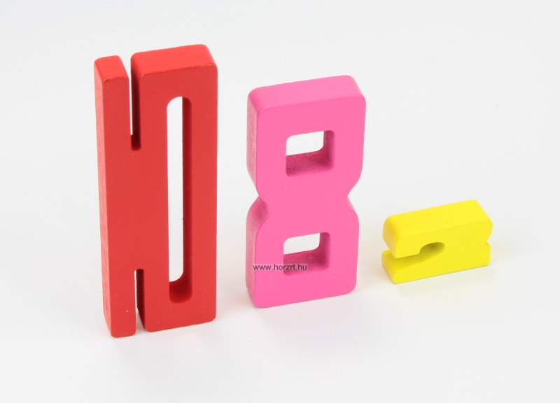 Ez az egyedi formájú, színes fa számkészlet játékos módon vezeti be a gyermekeket a számok és az összeadás világába. A számjegyek mind ugyanolyan vastagságúak, de a magasságuk arányos a szám értékével – például az 5-ös kétszer olyan magas, mint a 2-es és ötször magasabb, mint az 1-es.