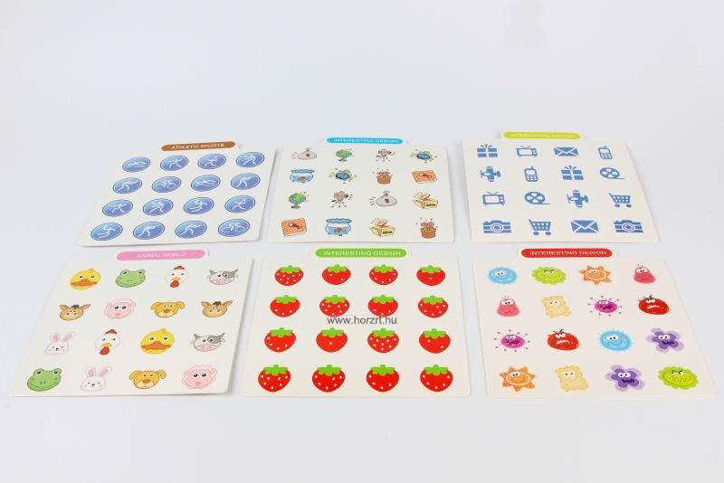 - 6 db kétoldalas minta- és feladványkártya (gyümölcsök, állatok, sportok, figurák stb.)