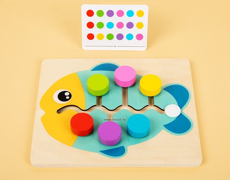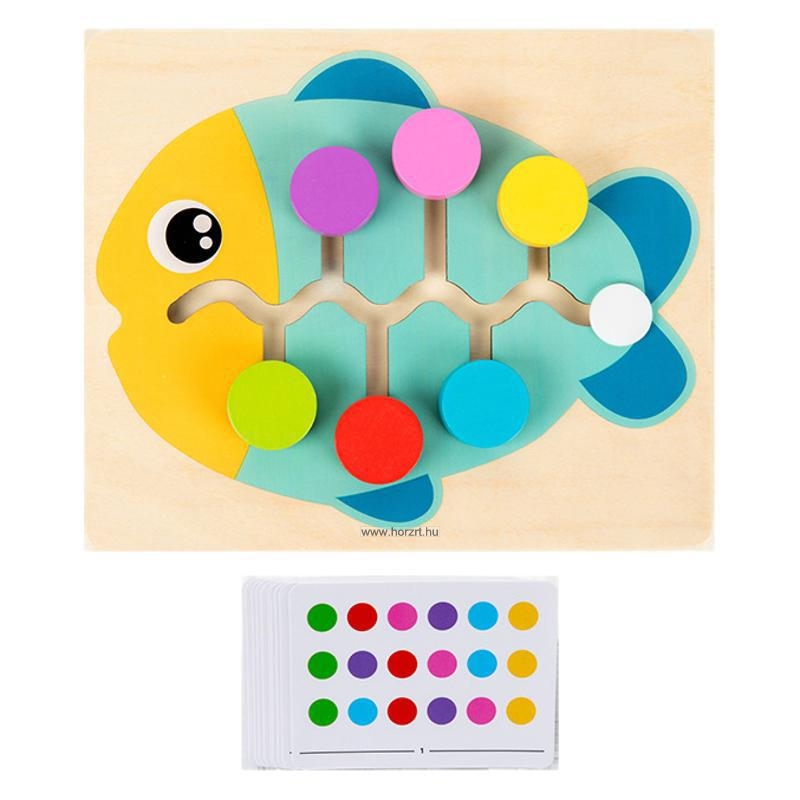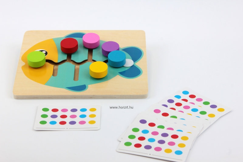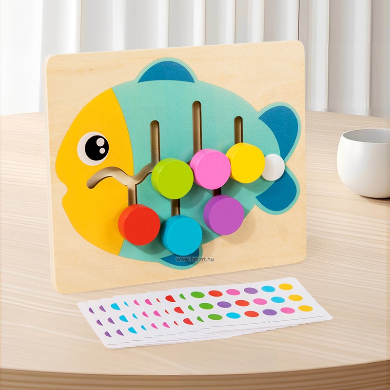 Ez a színes halas csúsztatós játék egy kiváló fejlesztőeszköz az óvodás korú gyermekek számára. A cél, hogy a gyermek a színes korongokat a megadott mintakártyák alapján a megfelelő sorrendbe mozgassa a hal testén belül.